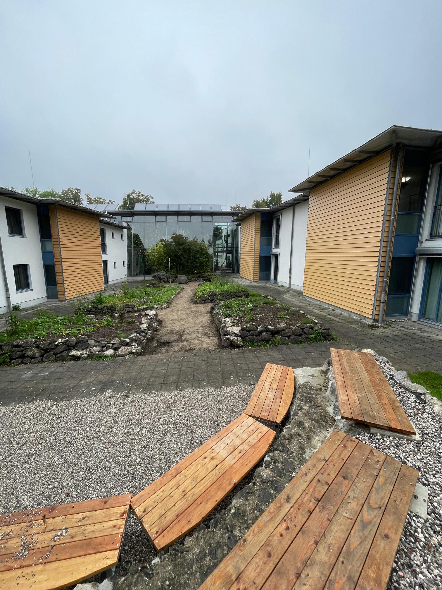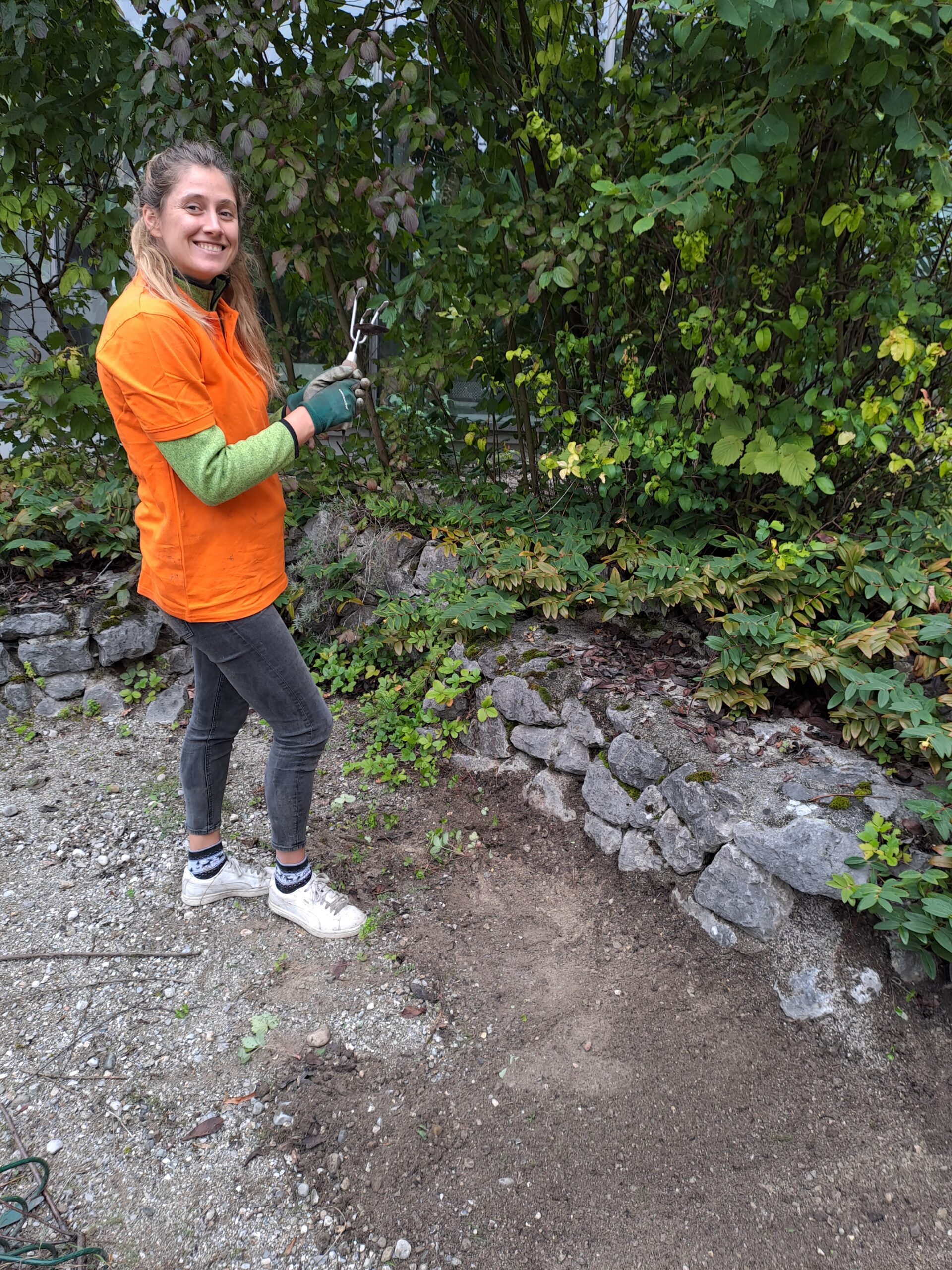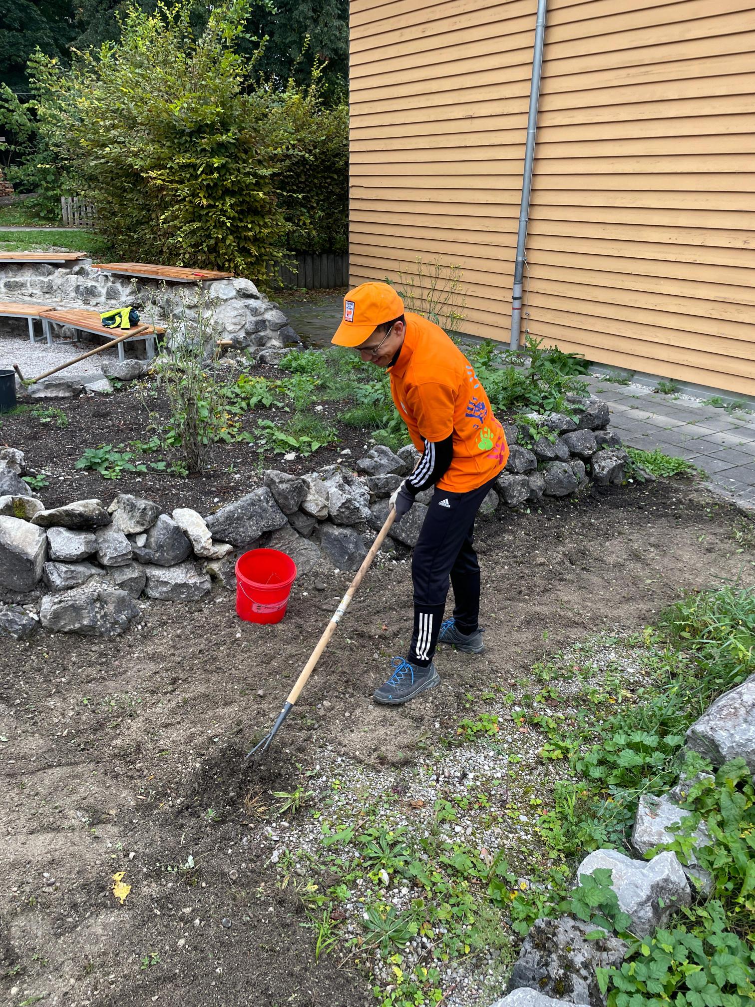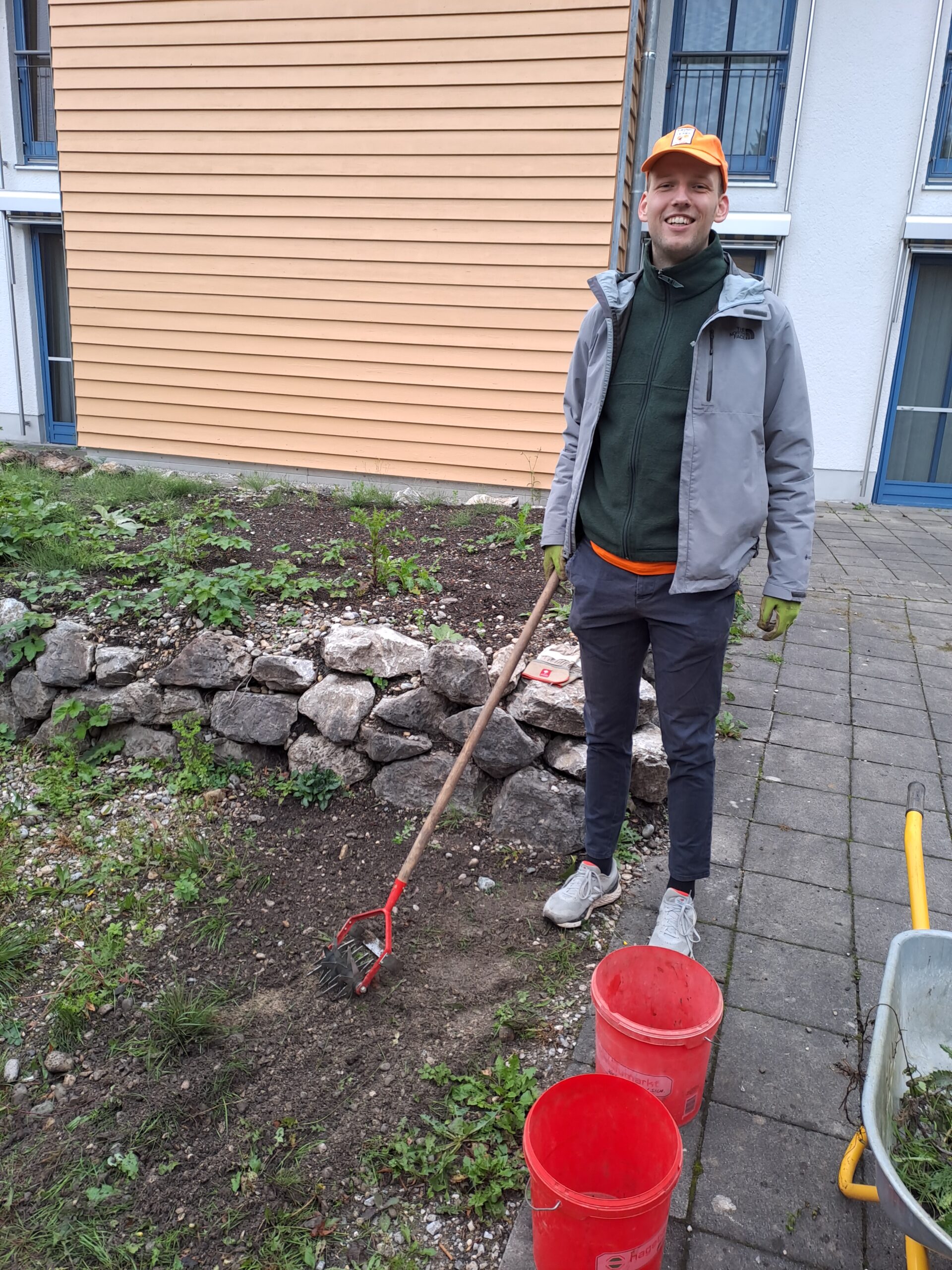 While the “school benches” had already been installed, this time the agenda included important preparatory work for the gravel path that still needed to be laid. First, the weeds had to be removed so that the path could be compacted and covered with gravel in the next step. A sun sail will eventually be stretched over it. After several hours of weeding, both our colleagues and the the gardener who provided on-site support were satisfied with the result.